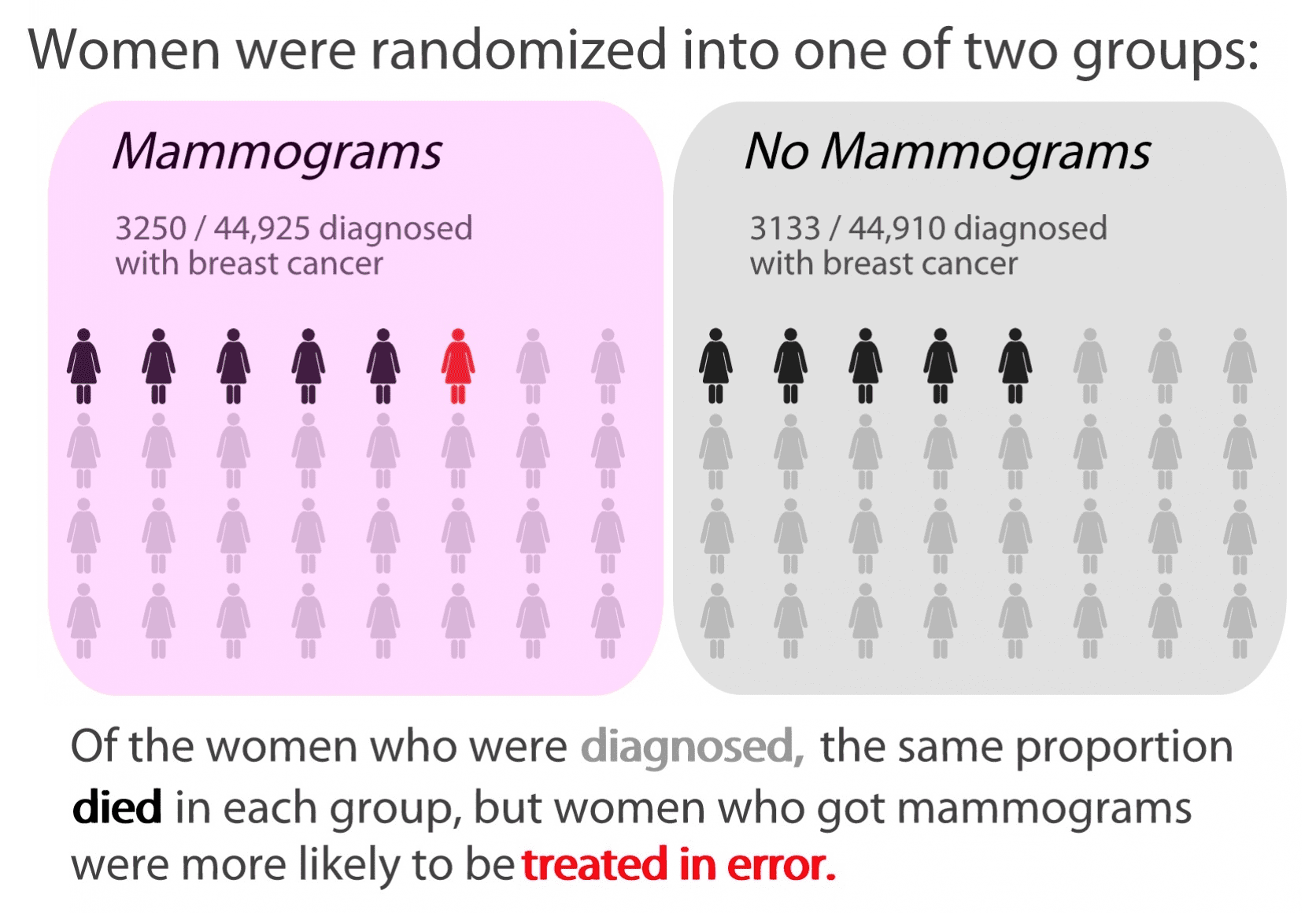 In a randomized controlled study (the gold standard of medical research), women who received regular mammograms were no less likely to die of breast cancer than those who went without. Although they received no additional protection, women who were screened paid an additional price. One in five of the cancers or abnormalities identified by mammography were ultimately harmless, but the women went through biopsies in order to be sure. Even worse, one out of every 424 women who were screened received treatment for a nonexistent cancer, enduring needless and debilitating radiation, chemotherapy, or surgery.