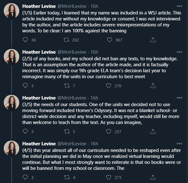 In an infinitely less important, but still telling case, when the Wall Street Journal reported the other day that a teacher named Heather Levine bragged about getting “The Odyssey” cancelled in her school, because it’s white supremacist, Levine was indignant on social media: