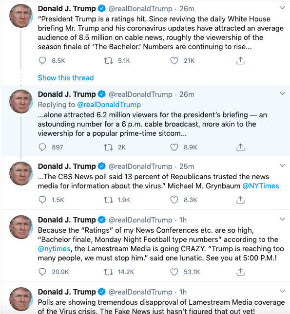 UPDATE.2: Dr. Fauci was on TV this morning warning that we are looking at 100,000 to 200,000 American deaths. Meanwhile, Trump was tweeting about how great his ratings are. This is the defining moment of his presidency, even his life. Character really is destiny.