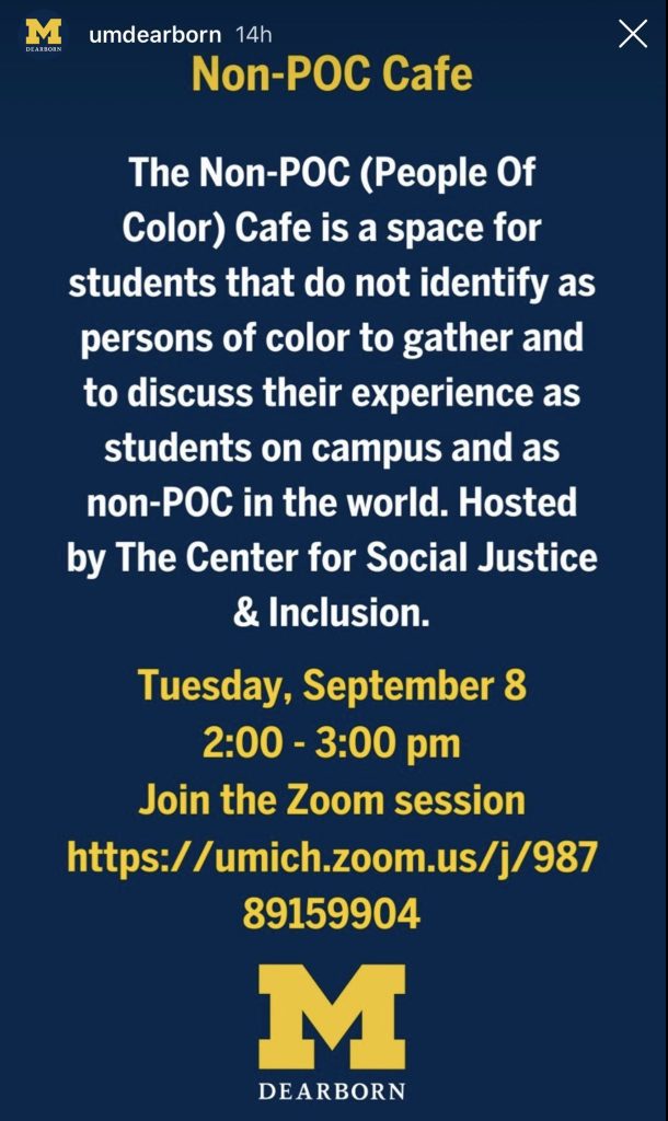 You got that right: a whites-only space, established by the campus social justice commissariat, to encourage people to think of themselves in terms of racial difference. What a sick, self-destructive world these identity politics progressives are building for us. Can you think of a single historical example of a successful society that encouraged its members to think constantly about racial identity? At the risk of sounding like a broken record, the social-justice left is calling up demons that it will not be able to control.
