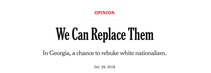 On Saturday morning, Abrams closed by reminding the crowd of Kemp’s views on democracy. “He said he is concerned that if everyone eligible to vote in Georgia does so, he will lose this election,” she said. “Let’s prove him right.” In a week, American voters can do to white nationalists what they fear most. Show them they’re being replaced.
