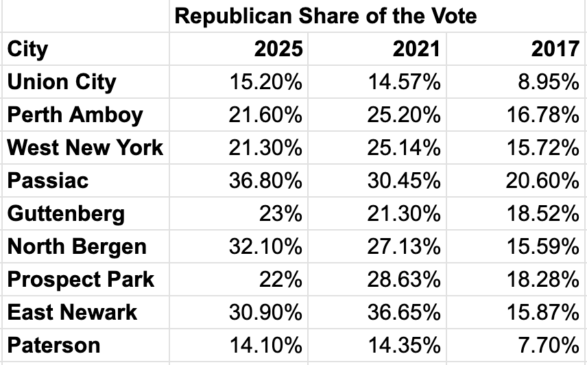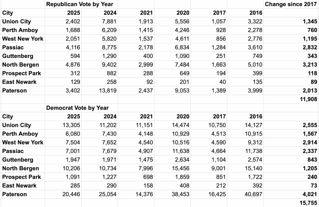 Even in Latino-majority areas that swung to the left from 2024 to 2025, rolls show that Republicans’ raw vote growth in cities including Passaic, East Newark, and North Bergen is larger than Democrats’ since 2017. That’s about the same level of support the Republican gubernatorial nominee received compared to Trump’s raw vote total in those cities in 2017 and 2021.