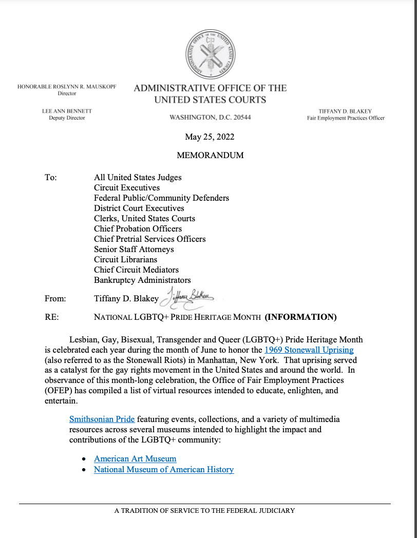 The bureaucracy that runs the US federal court system sent out to every federal judge and federal judicial official a list of books and resources to “educate, enlighten, and entertain” them during the High Holy Month of Pride. Here are some of the titles that the bureaucrats — specifically, Tiffany D. Blakey, Fair Employment Practices Officer of the Administrative Office of the US Courts — think are important for federal judges to read: