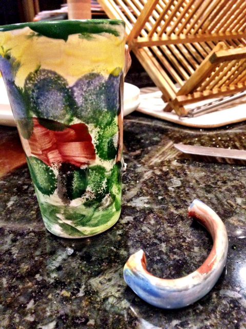 Is that strange? Sure, I guess. But little things like this make me realize how much the mundanity of our lives can take on what you might call a liturgical sense. That is, a familiar way or pattern of doing things can come to seem like a formula for establishing a connection to the sacred. Mind you, there is nothing actually sacred about drinking morning coffee. But me, I love coffee — I really love coffee — and there’s almost no better time of day than the quiet minutes when everyone else is asleep, and I’m rising to meet the day, and seeing what happened overnight. What news is there? Who wrote to me? What will I talk about to my readers today? This time is sacred to me, because what I do is look out across the world and write about it. The absent-minded ritual of lifting the cup to my mouth, drinking in the morning, and setting my day off right, has become important to me in a way I hadn’t fully appreciated until this morning, when somebody moved something just a bit, and I discovered by the breaking of my favorite mug that things weren’t where they were supposed to be. Now the rite is undone, or at least cannot be performed perfectly.