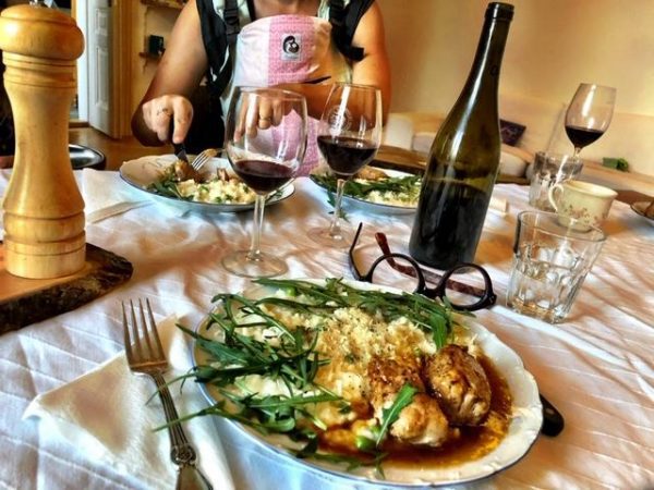 I came back to the hotel to do some work on the speech I’ll be delivering on Friday in Budapest, and then later headed over to Timo’s for dinner. (Remember Timo and his wife Petra from earlier this year?) I got to meet his new son, Baby Elias. Here’s a VFYT from the Krizka family table. That’s Elias sleeping in the Baby Bjorn on Mama Petra’s chest. The wine was homemade, and delicious. The arugula on the risotto was from their own garden: