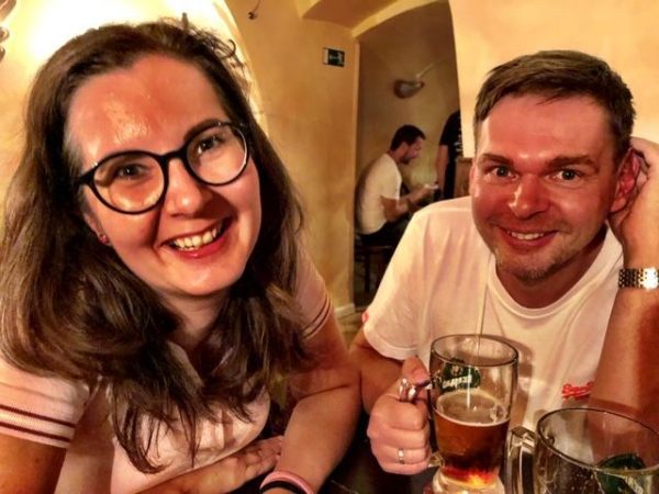 After dinner, Juraj, Timo and I walked over to a pub and met some more folks from the Hanus Fellowship, a Christian civic organization, for beer and conversation. Here’s a party pic of Martina and her husband Juraj (not Juraj Sust) — Evangelical Christians who have really interesting takes on politics and culture, and who are very up to date on currents in American conservative politics: