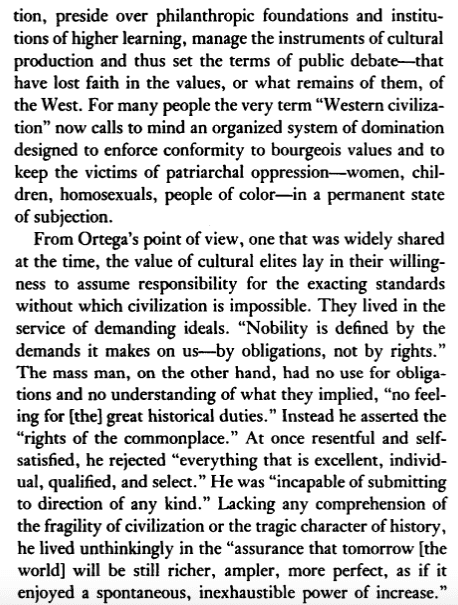 Lasch quotes Ortega’s indictment of mass man as guilty of “radical ingratitude” — which, for Lasch, describes the new American elite. It’s amazing to read this book, which was written at the beginning of the process of true globalization, and to encounter how much Lasch understood about what globalization was, and the way it would affect not only economic class, but cultural values. The final words of Lasch’s first chapter really do bring the dread when read from anno Domini 2020. He’s talking about “middle-class nationalism” of the kind looked down on by elites: