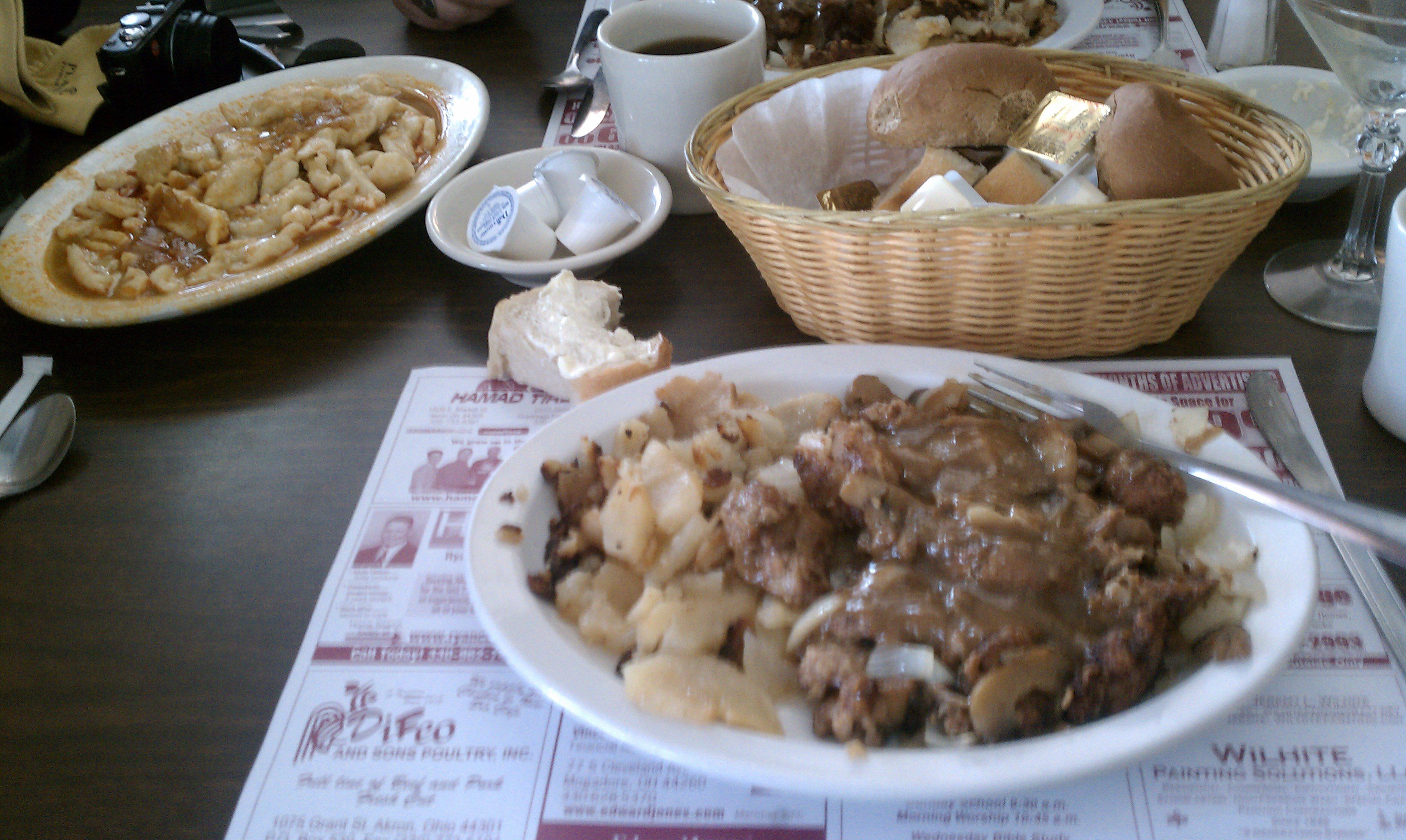 … the New Era, a Croatian restaurant in Akron. Their speciality is chicken paprikash. But this shows what I had, which was chicken livers pan friend with mushrooms and onions, with homefried potatoes, and a side of their homemade dumplings covered with the paprikash juice.